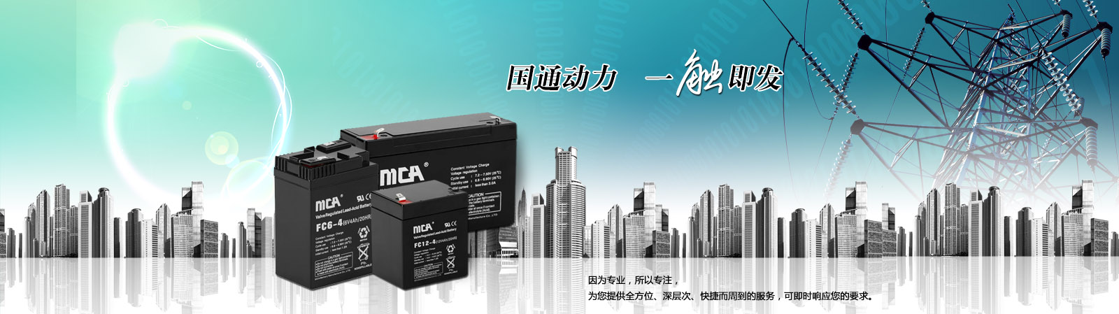 廣東中商國通MCA蓄電池創(chuàng)立于2001年8月,是專注鉛酸蓄電池的研制、開發(fā)、制造和銷售的高新科技企業(yè),MCA蓄電池公司主導(dǎo)產(chǎn)品為通信用電池、動(dòng)力電池、光伏儲能用電池、高功率電池。 MCA電池產(chǎn)品廣泛應(yīng)用于通信、電力、金融、鐵路等基礎(chǔ)性產(chǎn)業(yè);太陽能、風(fēng)能、智能電網(wǎng)、電動(dòng)汽車、儲能電站等戰(zhàn)略性新興產(chǎn)業(yè)。MCA蓄電池經(jīng)過十余年的發(fā)展,MCA公司已成為國內(nèi)外知名的電池制造商。